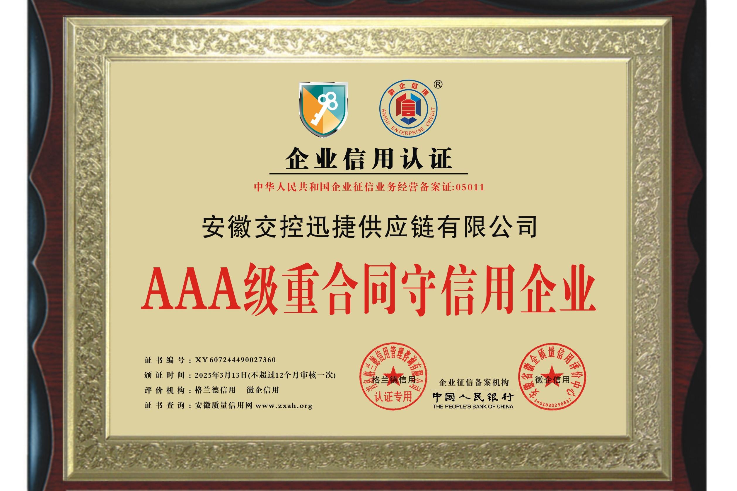 迅捷供應鏈公司獲評“AAA級重合同守信用企業”
